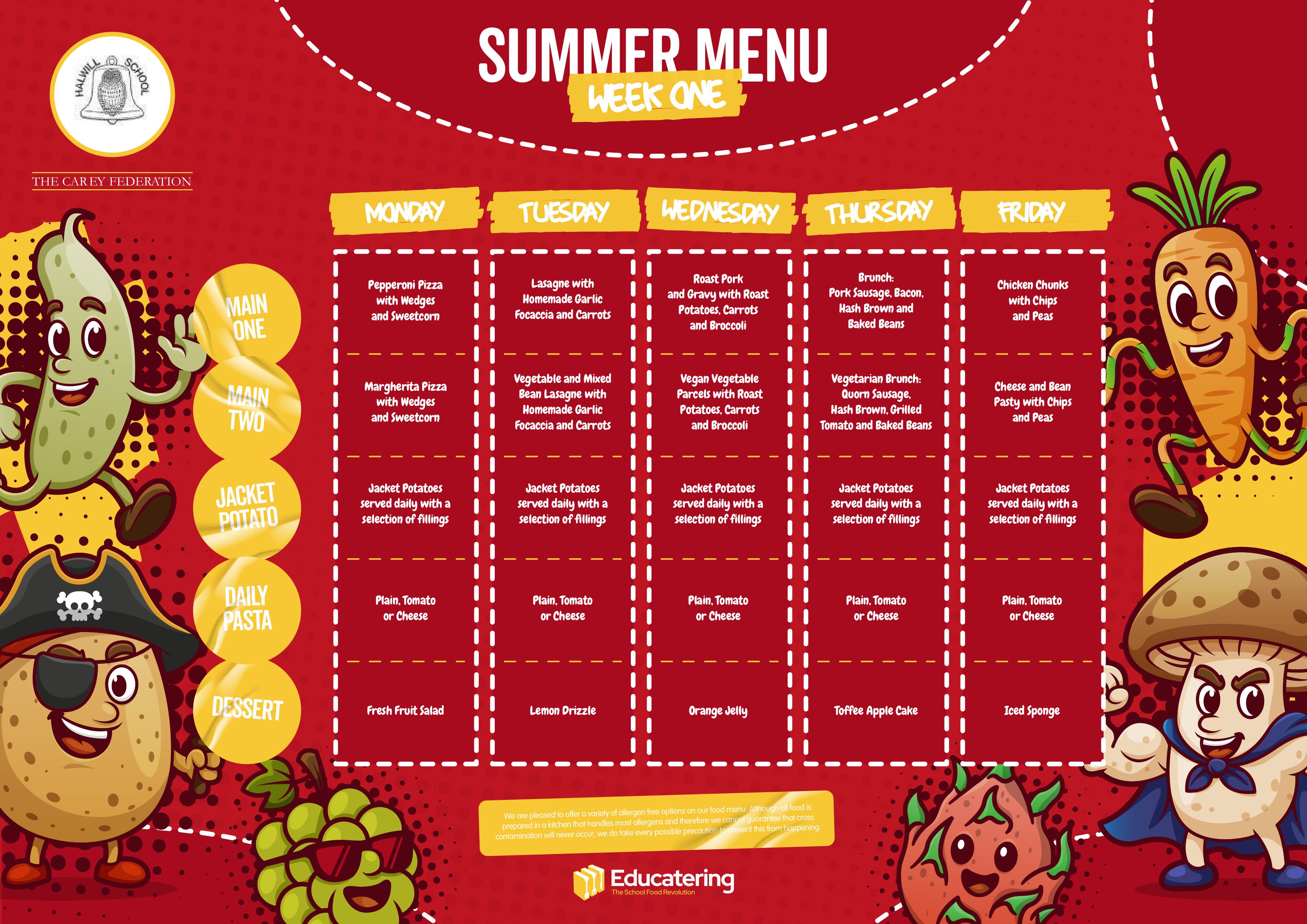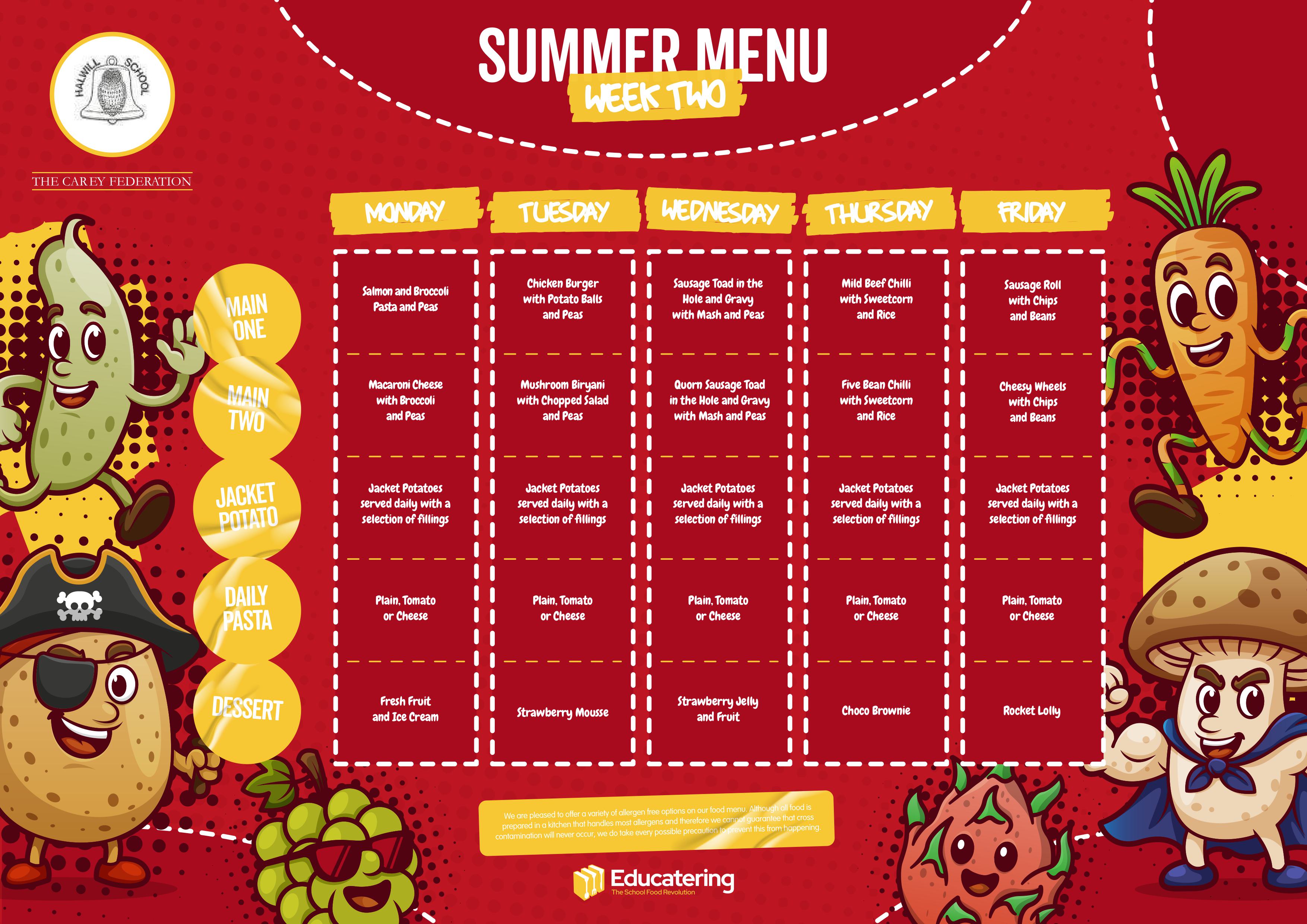 The three weekly rotating menu includes a main, vegetarian and a jacket potato option each day. The current menu can be downloaded off this page.